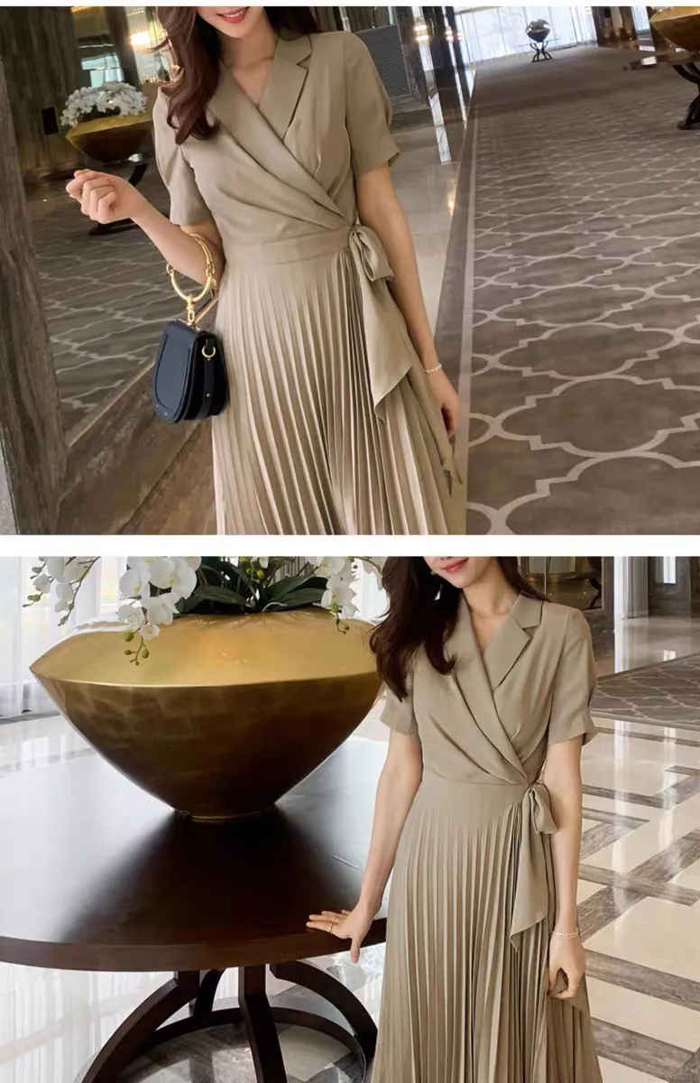 法式过膝蝴蝶结系带中长款高腰百褶雪纺复古连衣裙